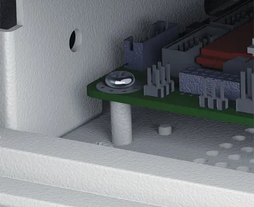 Ces vis peuvent également être utilisées en combinaison avec le kit de montage pour circuit imprimé M5600001, afin de fixer les circuits imprimés sur les montants de montage en plastique. Les points de fixation sont fournis dans les boitiers suivants pour ce kit: COMBIMET 19", VERSAMET 19", UNIMET 19", UNIDESK, UNIMET, UNIMET-PLUS, DATAMET