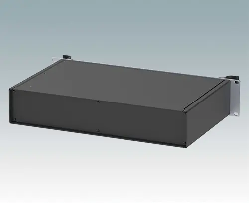 Boitiers polyvalents 19” avec une plaque avant en aluminium anodisé et 2 poignées ergonomiques en face avant. Le corps du boîtier est composé de deux panneaux latéraux avec une partie supérieure, inférieure et arrière amovible. La partie inférieure est pourvue de trous facilitant le montage de PCB ou de la plaque de montage (en accessoire). Les différentes parties sont munies de vis de mise à la terre M4 pour la sécurité électrique.