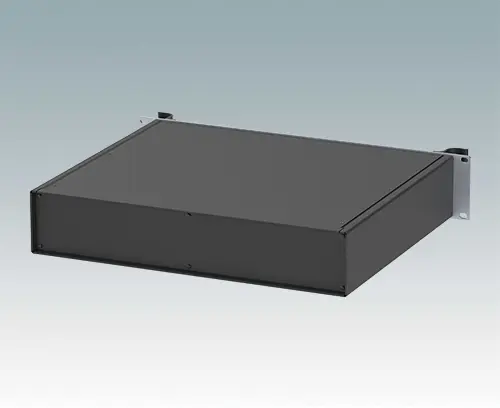 Boitiers polyvalents 19” avec une plaque avant en aluminium anodisé et 2 poignées ergonomiques en face avant. Le corps du boîtier est composé de deux panneaux latéraux avec une partie supérieure, inférieure et arrière amovible. La partie inférieure est pourvue de trous facilitant le montage de PCB ou de la plaque de montage (en accessoire). Les différentes parties sont munies de vis de mise à la terre M4 pour la sécurité électrique.