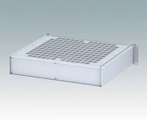 Boitiers polyvalents 19” avec une plaque avant en aluminium anodisé et 2 poignées ergonomiques en face avant. Le corps du boîtier est composé de deux panneaux latéraux avec une partie supérieure, inférieure et arrière amovible. La partie inférieure est pourvue de trous facilitant le montage de PCB ou de la plaque de montage (en accessoire). Les différentes parties sont munies de vis de mise à la terre M4 pour la sécurité électrique.