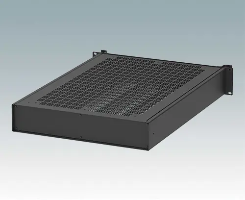 Boitiers polyvalents 19”, 24 pouces de profondeur, avec une plaque avant en aluminium peint en noir et 2 poignées ergonomiques en face avant. Le corps du boîtier est composé de deux panneaux latéraux avec une partie supérieure, inférieure et arrière amovible. La partie inférieure est pourvue de trous facilitant le montage de PCB ou de la plaque de montage (en accessoire). Les différentes parties sont munies de vis de mise à la terre M4 pour la sécurité électrique.