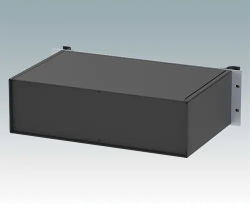 Boitiers polyvalents 19” avec une plaque avant en aluminium anodisé et 2 poignées ergonomiques en face avant. Le corps du boîtier est composé de deux panneaux latéraux avec une partie supérieure, inférieure et arrière amovible. La partie inférieure est pourvue de trous facilitant le montage de PCB ou de la plaque de montage (en accessoire). Les différentes parties sont munies de vis de mise à la terre M4 pour la sécurité électrique.