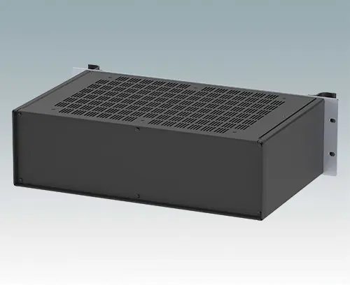 Boitiers polyvalents 19” avec une plaque avant en aluminium anodisé et 2 poignées ergonomiques en face avant. Le corps du boîtier est composé de deux panneaux latéraux avec une partie supérieure, inférieure et arrière amovible. La partie inférieure est pourvue de trous facilitant le montage de PCB ou de la plaque de montage (en accessoire). Les différentes parties sont munies de vis de mise à la terre M4 pour la sécurité électrique.