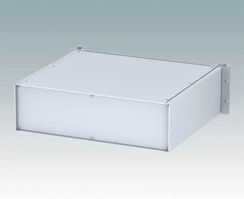 Boitiers polyvalents 19” avec une plaque avant en aluminium anodisé et 2 poignées ergonomiques en face avant. Le corps du boîtier est composé de deux panneaux latéraux avec une partie supérieure, inférieure et arrière amovible. La partie inférieure est pourvue de trous facilitant le montage de PCB ou de la plaque de montage (en accessoire). Les différentes parties sont munies de vis de mise à la terre M4 pour la sécurité électrique.