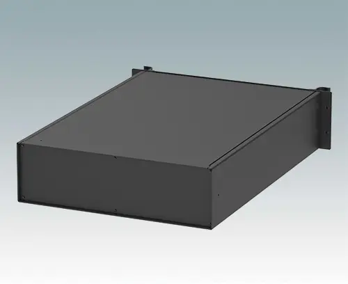 Boitiers polyvalents 19”, 24 pouces de profondeur, avec une plaque avant en aluminium peint en noir et 2 poignées ergonomiques en face avant. Le corps du boîtier est composé de deux panneaux latéraux avec une partie supérieure, inférieure et arrière amovible. La partie inférieure est pourvue de trous facilitant le montage de PCB ou de la plaque de montage (en accessoire). Les différentes parties sont munies de vis de mise à la terre M4 pour la sécurité électrique.