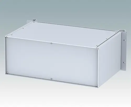 Boitiers polyvalents 19” avec une plaque avant en aluminium anodisé et 2 poignées ergonomiques en face avant. Le corps du boîtier est composé de deux panneaux latéraux avec une partie supérieure, inférieure et arrière amovible. La partie inférieure est pourvue de trous facilitant le montage de PCB ou de la plaque de montage (en accessoire). Les différentes parties sont munies de vis de mise à la terre M4 pour la sécurité électrique.