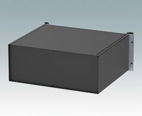 Boitiers polyvalents 19” avec une plaque avant en aluminium anodisé et 2 poignées ergonomiques en face avant. Le corps du boîtier est composé de deux panneaux latéraux avec une partie supérieure, inférieure et arrière amovible. La partie inférieure est pourvue de trous facilitant le montage de PCB ou de la plaque de montage (en accessoire). Les différentes parties sont munies de vis de mise à la terre M4 pour la sécurité électrique.