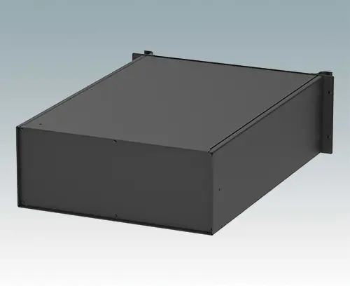 Boitiers polyvalents 19”, 24 pouces de profondeur, avec une plaque avant en aluminium peint en noir et 2 poignées ergonomiques en face avant. Le corps du boîtier est composé de deux panneaux latéraux avec une partie supérieure, inférieure et arrière amovible. La partie inférieure est pourvue de trous facilitant le montage de PCB ou de la plaque de montage (en accessoire). Les différentes parties sont munies de vis de mise à la terre M4 pour la sécurité électrique.