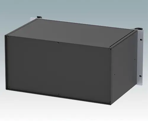 Boitiers polyvalents 19” avec une plaque avant en aluminium anodisé et 2 poignées ergonomiques en face avant. Le corps du boîtier est composé de deux panneaux latéraux avec une partie supérieure, inférieure et arrière amovible. La partie inférieure est pourvue de trous facilitant le montage de PCB ou de la plaque de montage (en accessoire). Les différentes parties sont munies de vis de mise à la terre M4 pour la sécurité électrique.