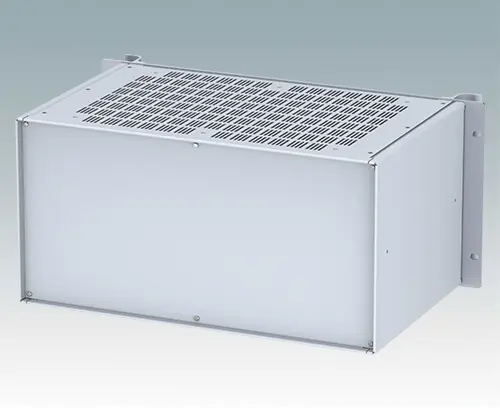 Boitiers polyvalents 19” avec une plaque avant en aluminium anodisé et 2 poignées ergonomiques en face avant. Le corps du boîtier est composé de deux panneaux latéraux avec une partie supérieure, inférieure et arrière amovible. La partie inférieure est pourvue de trous facilitant le montage de PCB ou de la plaque de montage (en accessoire). Les différentes parties sont munies de vis de mise à la terre M4 pour la sécurité électrique.