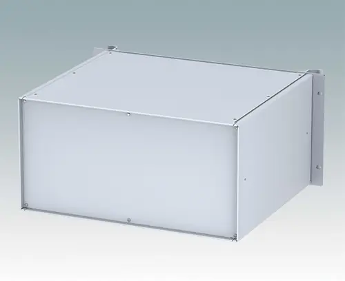 Boitiers polyvalents 19” avec une plaque avant en aluminium anodisé et 2 poignées ergonomiques en face avant. Le corps du boîtier est composé de deux panneaux latéraux avec une partie supérieure, inférieure et arrière amovible. La partie inférieure est pourvue de trous facilitant le montage de PCB ou de la plaque de montage (en accessoire). Les différentes parties sont munies de vis de mise à la terre M4 pour la sécurité électrique.