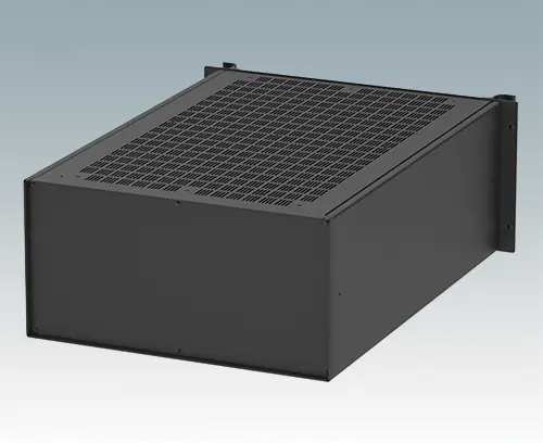 Boitiers polyvalents 19”, 24 pouces de profondeur, avec une plaque avant en aluminium peint en noir et 2 poignées ergonomiques en face avant. Le corps du boîtier est composé de deux panneaux latéraux avec une partie supérieure, inférieure et arrière amovible. La partie inférieure est pourvue de trous facilitant le montage de PCB ou de la plaque de montage (en accessoire). Les différentes parties sont munies de vis de mise à la terre M4 pour la sécurité électrique.