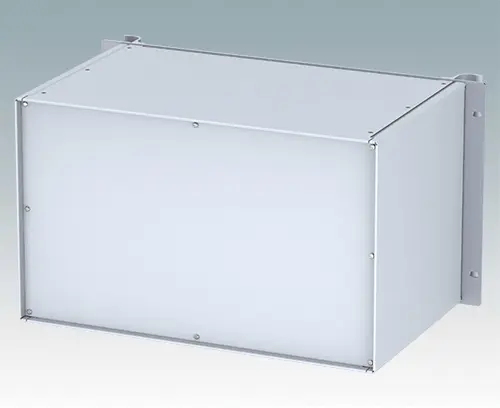 Boitiers polyvalents 19” avec une plaque avant en aluminium anodisé et 2 poignées ergonomiques en face avant. Le corps du boîtier est composé de deux panneaux latéraux avec une partie supérieure, inférieure et arrière amovible. La partie inférieure est pourvue de trous facilitant le montage de PCB ou de la plaque de montage (en accessoire). Les différentes parties sont munies de vis de mise à la terre M4 pour la sécurité électrique.