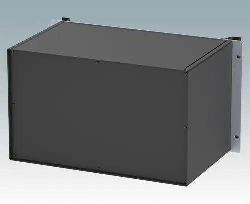 Boitiers polyvalents 19” avec une plaque avant en aluminium anodisé et 2 poignées ergonomiques en face avant. Le corps du boîtier est composé de deux panneaux latéraux avec une partie supérieure, inférieure et arrière amovible. La partie inférieure est pourvue de trous facilitant le montage de PCB ou de la plaque de montage (en accessoire). Les différentes parties sont munies de vis de mise à la terre M4 pour la sécurité électrique.