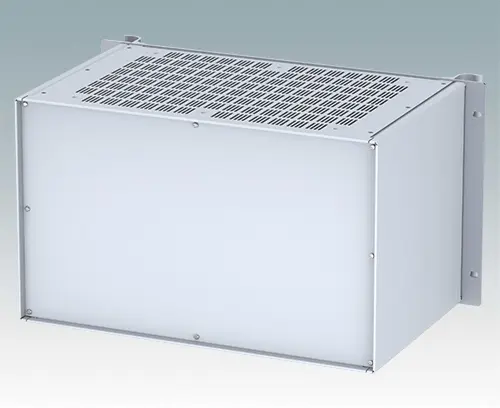 Boitiers polyvalents 19” avec une plaque avant en aluminium anodisé et 2 poignées ergonomiques en face avant. Le corps du boîtier est composé de deux panneaux latéraux avec une partie supérieure, inférieure et arrière amovible. La partie inférieure est pourvue de trous facilitant le montage de PCB ou de la plaque de montage (en accessoire). Les différentes parties sont munies de vis de mise à la terre M4 pour la sécurité électrique.