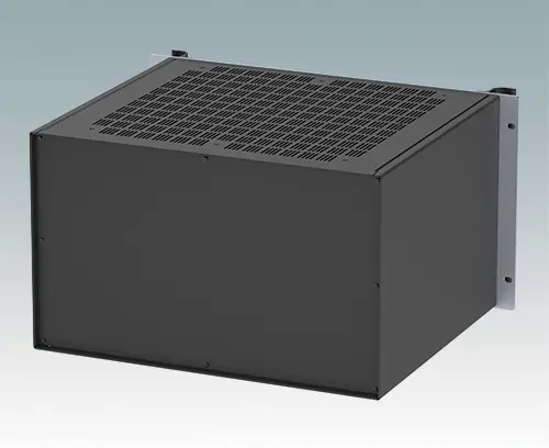 Boitiers polyvalents 19” avec une plaque avant en aluminium anodisé et 2 poignées ergonomiques en face avant. Le corps du boîtier est composé de deux panneaux latéraux avec une partie supérieure, inférieure et arrière amovible. La partie inférieure est pourvue de trous facilitant le montage de PCB ou de la plaque de montage (en accessoire). Les différentes parties sont munies de vis de mise à la terre M4 pour la sécurité électrique.