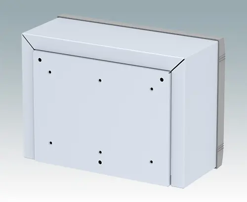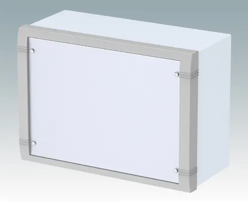 Boitier en aluminium modernes pour des applications d'intérieur. Accès à l'électronique sans barrière pendant l'installation au mur. Design élégant avec bandeaux frontaux, partie supérieure et panneau arrière en forme L moulés sous pression. Plaque avant et plaque support à commander séparément.