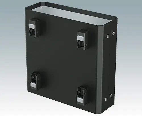 Fourniture Partie supérieure, plaque inférieure, plaque avant 19”, plaque arrière, poignées, M3 x 8 mm (x4), M3 x 8 mm (x4), Écrou et rondelle de joint M4 (x4). Fourni entièrement assemble.
