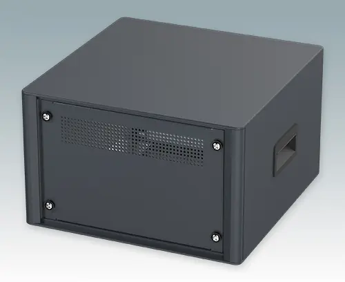Boitiers 10.5" modernes pour instruments. Conçus pour installer des tiroirs 4U (42HP), des châssis et panneaux avant. Conforme aux normes DIN 41494 et IEC 297. Cadres frontaux et arrière élégants sur le corps de boitier en aluminium. Des cache-vis encliquetables à l'avant et l'arrière masquent les vis de fixation du boitier, et confèrent ainsi à l'ensemble une apparence très professionnelle. Toutes les plaques de boitier sont munies de piliers filetés M4 pour les connexions de mise à la terre. Le boitier comprend une plaque arrière, deux poignées latérales en ABS et quatre pieds ronds en plastique avec caoutchouc antiglisse. La base et la plaque arrière sont dotées de fentes d'aération. Barrettes de support de sub-rack/châssis.