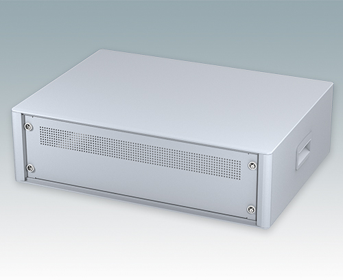 Boitiers 19" modernes pour instruments. Conçus pour installer des tiroirs 3U (84HP), des châssis et panneaux avant. Conforme aux normes DIN 41494 et IEC 297-1. Cadres frontaux et arrière élégants sur le corps de boitier en aluminium. Des cache-vis encliquetables à l'avant et l'arrière masquent les vis de fixation du boitier, et confèrent ainsi à l'ensemble une apparence très professionnelle. Toutes les plaques de boîtier sont munies de piliers filetés M4 pour les connexions de mise à la terre.