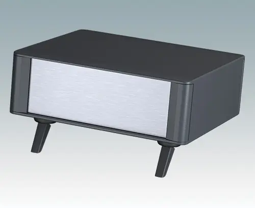 Boitiers pupitres modernes et élégants pour électronique de table. Cadres frontaux et arrière élégants sur le corps de boitier en aluminium. Des cache-vis encliquetables à l'avant et l'arrière masquent les vis de fixation du boitier et celles de la plaque avant, et confèrent ainsi à l'ensemble une apparence très professionnelle. La base du châssis interne pré-assemblé comprend quatre pieds de montage M3 pour carte de circuits imprimés. Le châssis interne peut aussi être équipé de 3 cartes de circuits imprimés grâce au guide-carte auxiliaire M6490020 (commander 2 guides par carte).