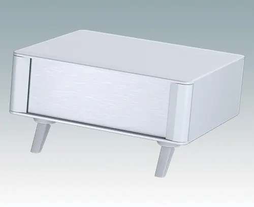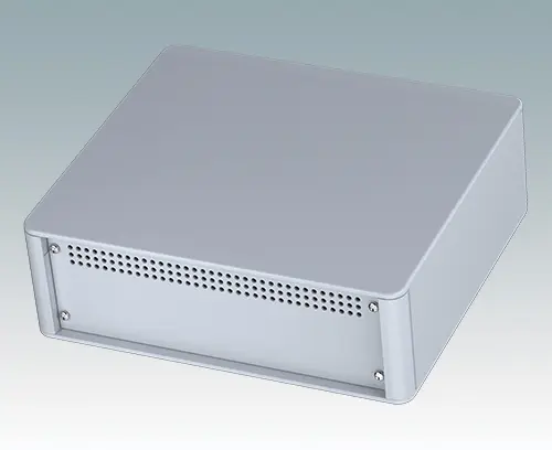 Boitiers pupitres modernes et élégants pour électronique de table. Cadres frontaux et arrière élégants sur le corps de boitier en aluminium. Des cache-vis encliquetables à l'avant et l'arrière masquent les vis de fixation du boitier et celles de la plaque avant, et confèrent ainsi à l'ensemble une apparence très professionnelle. La base du châssis interne pré-assemblé comprend quatre pieds de montage M3 pour carte de circuits imprimés. Le châssis interne peut aussi être équipé de 3 cartes de circuits imprimés grâce au guide-carte auxiliaire M6490020 (commander 2 guides par carte).