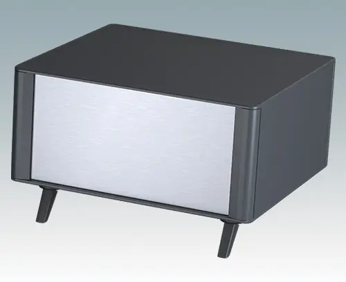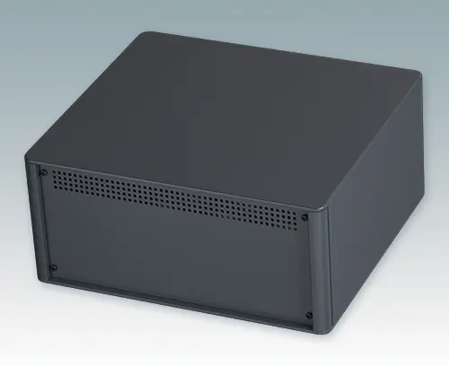 Boitiers pupitres modernes et élégants pour électronique de table. Cadres frontaux et arrière élégants sur le corps de boitier en aluminium. Des cache-vis encliquetables à l'avant et l'arrière masquent les vis de fixation du boitier et celles de la plaque avant, et confèrent ainsi à l'ensemble une apparence très professionnelle. La base du châssis interne pré-assemblé comprend quatre pieds de montage M3 pour carte de circuits imprimés. Le châssis interne peut aussi être équipé de 7 cartes de circuits imprimés grâce au guide-carte auxiliaire M6490010 (commander 4 guides par carte).