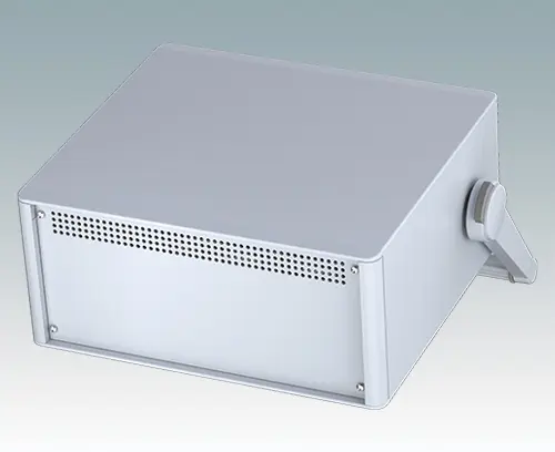 Boitier pour instruments modernes de ligne agréable avec anse/poignée étrier pour électronique de table et portable. Cadres frontaux et arrière élégants sur le corps de boitier en aluminium. Des cache-vis encliquetables à l'avant et l'arrière masquent les vis de fixation du boitier et celles de la plaque avant, et confèrent ainsi à l'ensemble une apparence très professionnelle. La poignée est orientable par crans de 30°. La base du châssis interne pré-assemblé comprend quatre pieds de montage M3 pour carte de circuits imprimés. Le châssis interne peut aussi être équipé de 7 cartes de circuits imprimés grâce au guide-carte auxiliaire M6490010 (commander 4 guides par carte).