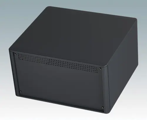 Boitiers pupitres modernes de ligne agréable pour électronique de table ou portable. Cadres frontaux et arrière élégants sur le corps de boitier en aluminium. Des cache-vis encliquetables à l'avant et l'arrière masquent les vis de fixation du boitier et celles de la plaque avant, et confèrent ainsi à l'ensemble une apparence très professionnelle. La base du châssis interne pré-assemblé comprend quatre pieds de montage M3 pour carte de circuits imprimés. Le châssis interne peut aussi être équipé de 9 cartes de circuits imprimés grâce au guide-carte auxiliaire M6490010 (commander 4 guides par carte).