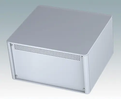 Boitiers pupitres modernes de ligne agréable pour électronique de table ou portable. Cadres frontaux et arrière élégants sur le corps de boitier en aluminium. Des cache-vis encliquetables à l'avant et l'arrière masquent les vis de fixation du boitier et celles de la plaque avant, et confèrent ainsi à l'ensemble une apparence très professionnelle. La base du châssis interne pré-assemblé comprend quatre pieds de montage M3 pour carte de circuits imprimés. Le châssis interne peut aussi être équipé de 9 cartes de circuits imprimés grâce au guide-carte auxiliaire M6490010 (commander 4 guides par carte).