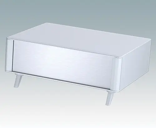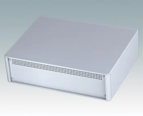 Boitiers pupitres modernes et élégants pour électronique de table. Cadres frontaux et arrière élégants sur le corps de boitier en aluminium. Des cache-vis encliquetables à l'avant et l'arrière masquent les vis de fixation du boitier et celles de la plaque avant, et confèrent ainsi à l'ensemble une apparence très professionnelle. La base du châssis interne pré-assemblé comprend quatre pieds de montage M3 pour carte de circuits imprimés. Le châssis interne peut aussi être équipé de 5 cartes de circuits imprimés grâce au guide-carte auxiliaire M6490010 (commander 4 guides par carte).