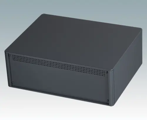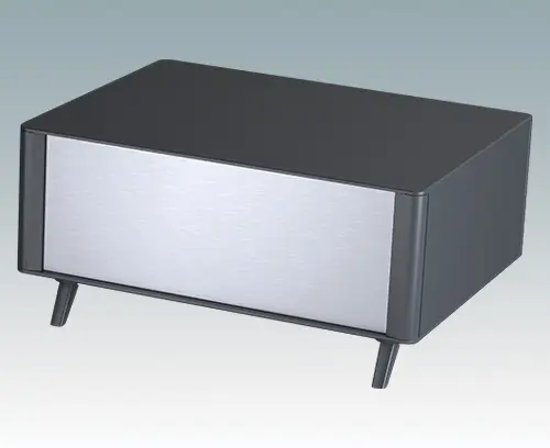 Boitiers pupitres modernes et élégants pour électronique de table. Cadres frontaux et arrière élégants sur le corps de boitier en aluminium. Des cache-vis encliquetables à l'avant et l'arrière masquent les vis de fixation du boitier et celles de la plaque avant, et confèrent ainsi à l'ensemble une apparence très professionnelle. La base du châssis interne pré-assemblé comprend quatre pieds de montage M3 pour carte de circuits imprimés. Le châssis interne peut aussi être équipé de 7 cartes de circuits imprimés grâce au guide-carte auxiliaire M6490010 (commander 4 guides par carte).