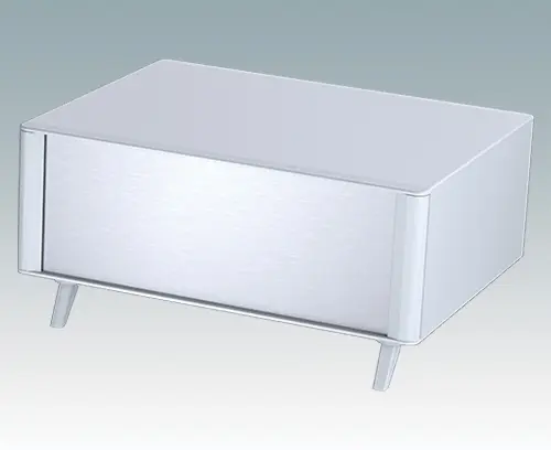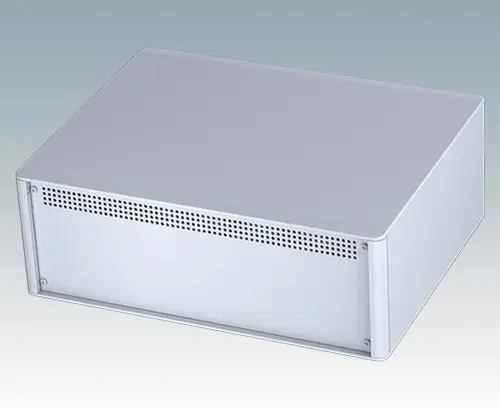 Boitiers pupitres modernes et élégants pour électronique de table. Cadres frontaux et arrière élégants sur le corps de boitier en aluminium. Des cache-vis encliquetables à l'avant et l'arrière masquent les vis de fixation du boitier et celles de la plaque avant, et confèrent ainsi à l'ensemble une apparence très professionnelle. La base du châssis interne pré-assemblé comprend quatre pieds de montage M3 pour carte de circuits imprimés. Le châssis interne peut aussi être équipé de 7 cartes de circuits imprimés grâce au guide-carte auxiliaire M6490010 (commander 4 guides par carte).