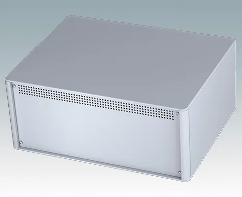 Boitiers pupitres modernes de ligne agréable pour électronique de table ou portable. Cadres frontaux et arrière élégants sur le corps de boitier en aluminium. Des cache-vis encliquetables à l'avant et l'arrière masquent les vis de fixation du boitier et celles de la plaque avant, et confèrent ainsi à l'ensemble une apparence très professionnelle. La base du châssis interne pré-assemblé comprend quatre pieds de montage M3 pour carte de circuits imprimés. Le châssis interne peut aussi être équipé de 9 cartes de circuits imprimés grâce au guide-carte auxiliaire M6490010 (commander 4 guides par carte).