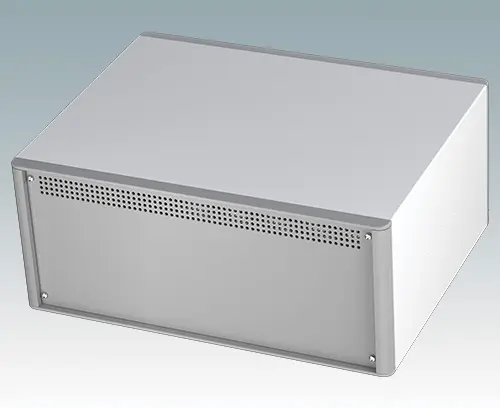 Boitiers pupitres modernes de ligne agréable pour électronique de table ou portable. Cadres frontaux et arrière élégants sur le corps de boitier en aluminium. Des cache-vis encliquetables à l'avant et l'arrière masquent les vis de fixation du boitier et celles de la plaque avant, et confèrent ainsi à l'ensemble une apparence très professionnelle. La base du châssis interne pré-assemblé comprend quatre pieds de montage M3 pour carte de circuits imprimés. Le châssis interne peut aussi être équipé de 9 cartes de circuits imprimés grâce au guide-carte auxiliaire M6490010 (commander 4 guides par carte).