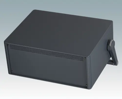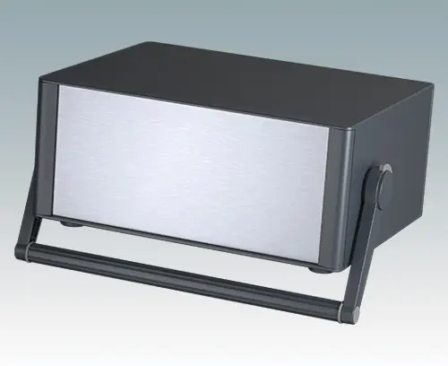 Boitier pour instruments modernes de ligne agréable avec anse/poignée étrier pour électronique de table et portable. Cadres frontaux et arrière élégants sur le corps de boitier en aluminium. Des cache-vis encliquetables à l'avant et l'arrière masquent les vis de fixation du boitier et celles de la plaque avant, et confèrent ainsi à l'ensemble une apparence très professionnelle. La poignée est orientable par crans de 30°. La base du châssis interne pré-assemblé comprend quatre pieds de montage M3 pour carte de circuits imprimés. Le châssis interne peut aussi être équipé de 9 cartes de circuits imprimés grâce au guide-carte auxiliaire M6490010 (commander 4 guides par carte).