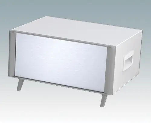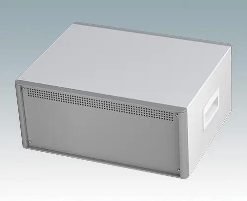 Le boitier comprend une plaque arrière, deux poignées latérales en ABS et quatre pieds dont deux basculables. La base et la plaque arrière sont dotées de fentes d'aération. Les plaques avant se commandent séparément.