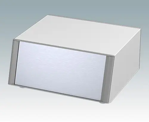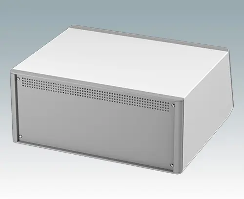 Boitiers pupitres modernes de ligne agréable avec panneau avant incliné pour électronique de table ou portable. Cadres frontaux et arrière élégants sur le corps de boitier en aluminium. Des cache-vis encliquetables à l'avant et l'arrière masquent les vis de fixation du boitier et celles de la plaque avant, et confèrent ainsi à l'ensemble une apparence très professionnelle. La base du châssis interne pré-assemblé comprend quatre pieds de montage M3 pour carte de circuits imprimés. Le châssis interne peut aussi être équipé de 9 cartes de circuits imprimés grâce au guide-carte auxiliaire M6490010 (commander 4 guides par carte). Le boitier comprend une plaque arrière et quatre pieds dont deux basculables. La base et la plaque arrière sont dotées de fentes d'aération. Les plaques avant se commandent séparément.