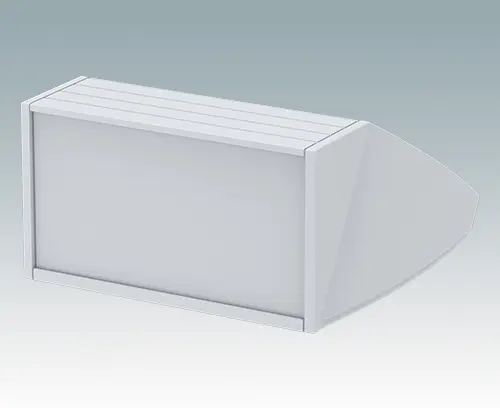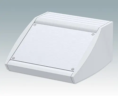 Boitier pupitre avec partie pour éléments de commande ergonomique et degré de protection IP 54 pour les applications de table ou murales. Boitier aluminium prémonté avec plaque inférieure amovible. Pour atteindre le degré de protection IP 54, utiliser le kit de montage pour circuit imprimé M 56 00 001 ou un kit de votre choix qui recouvre les points de fixation des circuits imprimés dans la plaque inférieure. Plaque avant en accessoire.