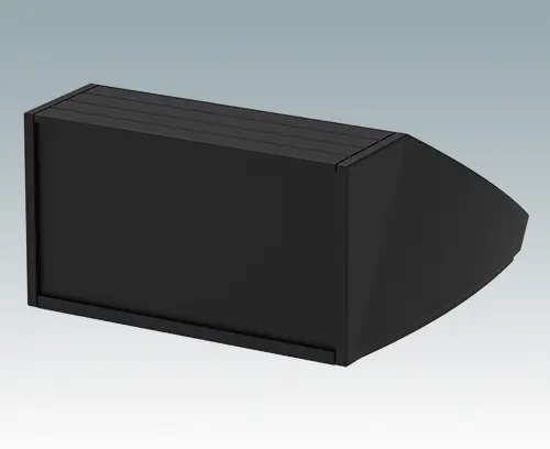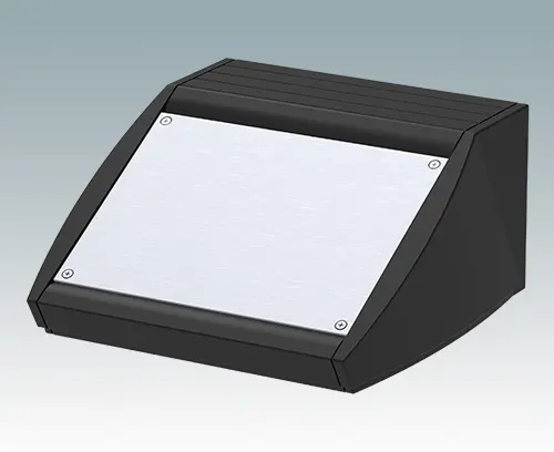 Boitier pupitre avec partie pour éléments de commande ergonomique pour les applications de table ou murales. Boitier aluminium prémonté avec plaque inférieure amovible. Plaque avant en accessoire.