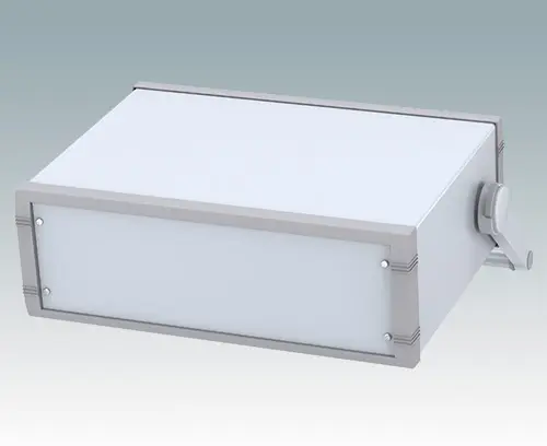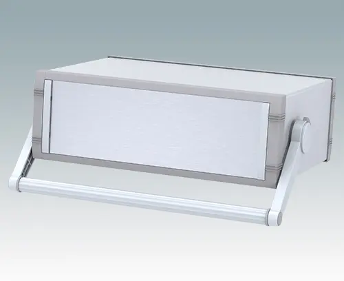 Boitier moderne en aluminium avec poignée étrier utilisable pour les applications de table et portables. Chassis interne pré-assemblé avec quatre guides-cartes encliquetables. Quatre positions de guide standard – sur demande, des perçages supplémentaires. Des cadres frontaux et arrières élégants qui s’asaptent au boîtier. Plaque arrière amovible et quatre pieds anti-glissants et autoadhésifs inclus. Kit de plaque avant en accessoire.