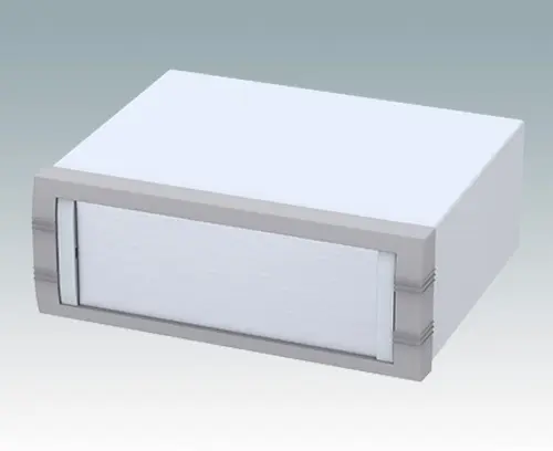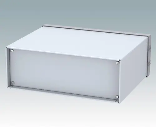 Boitier moderne pour instruments utilisable pour les applications de table ou portables. Partie supérieure au bord replié, en aluminium avec cadre frontal moulé sous pression. Les plaques inférieures et arrières sont amovibles. Kit de plaque avant en accessoire.