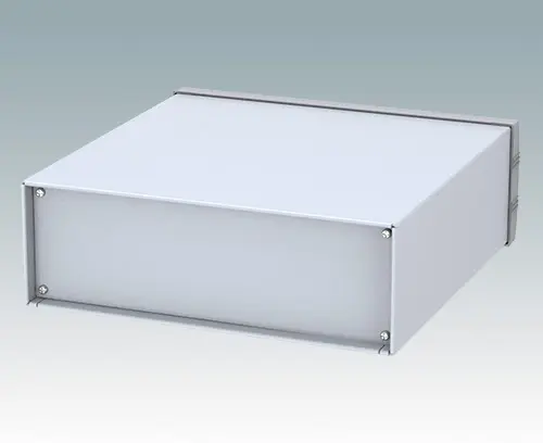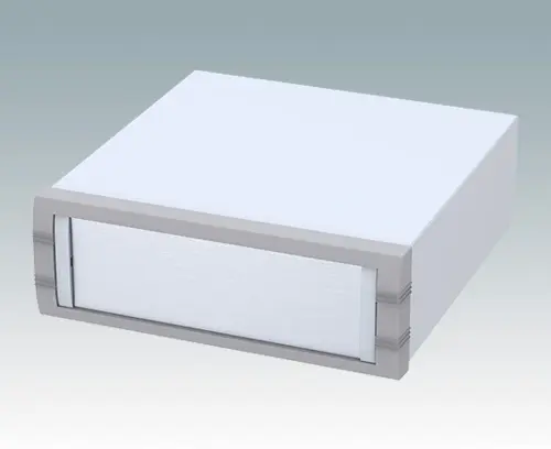 Boitier moderne pour instruments utilisable pour les applications de table ou portables. Partie supérieure au bord replié, en aluminium avec cadre frontal moulé sous pression. Les plaques inférieures et arrières sont amovibles. Kit de plaque avant en accessoire.