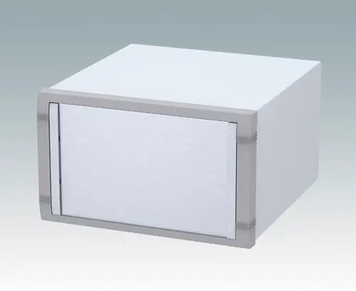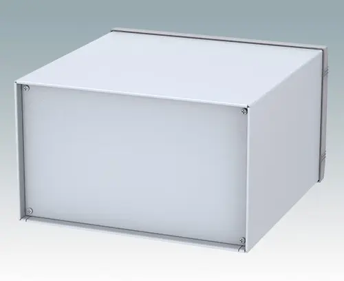 Boitier moderne pour instruments utilisable pour les applications de table ou portables. Partie supérieure au bord replié, en aluminium avec cadre frontal moulé sous pression. Les plaques inférieures et arrières sont amovibles. Kit de plaque avant en accessoire.