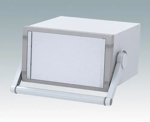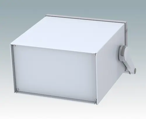Boitier moderne pour instruments utilisable pour les applications de table ou portables. Avec poignée étrier. Partie supérieure au bord replié, en aluminium avec cadre frontal moulé sous pression. Les plaques inférieures et arrières sont amovibles. Kit de plaque avant en accessoire.
